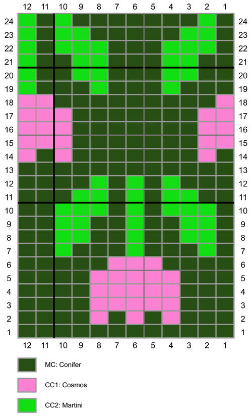 Join back in the round with MC, CC1, CC2 and US1.5 (2.5 mm) needle (or needle size to achieve gauge in colorwork). Beginning with Needle 1, resume knitting Colorwork Chart A, starting with rnd 14 and ending on rnd 24. Continue to repeat Colorwork Chart A until the sock is approximately 1¾ inches (4.5 cm) from the desired finished length, stopping after rnd 13. If necessary, knit a few more rnds with MC to get to this length.