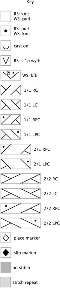 ROW 12:Kfb, k5, k to m, sm, k2, p1, k2, p8, k2, p1, k2, p2, k2, p4, k4, p4, k2, p2, k2, p1, k2, p8, k2, p1, k3. [65 sts]