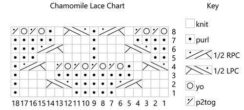 Next Rnd: Work Chamomile Lace pattern (beginning with Rnd 1 of chart or written instructions, worked over 18 sts per repeat) to end.