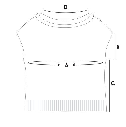 C) Underarm to Hem: 13 (13, 13, 14, 14, 15, 15, 15, 15) in / 33 (33, 33, 35.5, 35.5, 38, 38, 38, 38) cm – prior to blocking