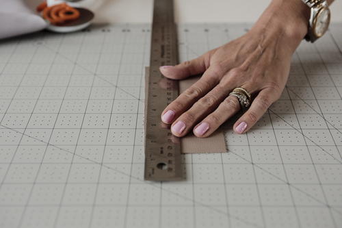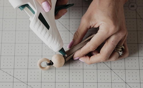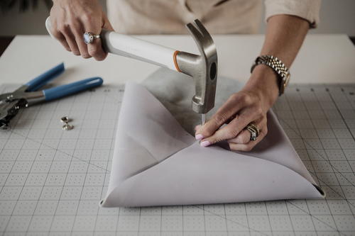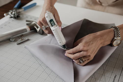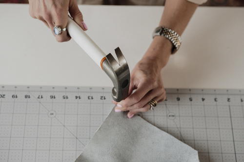 To protect your work surface, especially if you’re using the rotary cutter, make sure you lay down the Fiskars® Cutting Mat – DIY (18” x 24”). To make the most accurate measurements, use the Fiskars® Metal Ruler (18”). The last two tools you’ll need are the Fiskars® Precision Hammer and Fiskars® Lia Griffith Low-Temp Cordless Glue Gun for adhering your leather and clasp together."