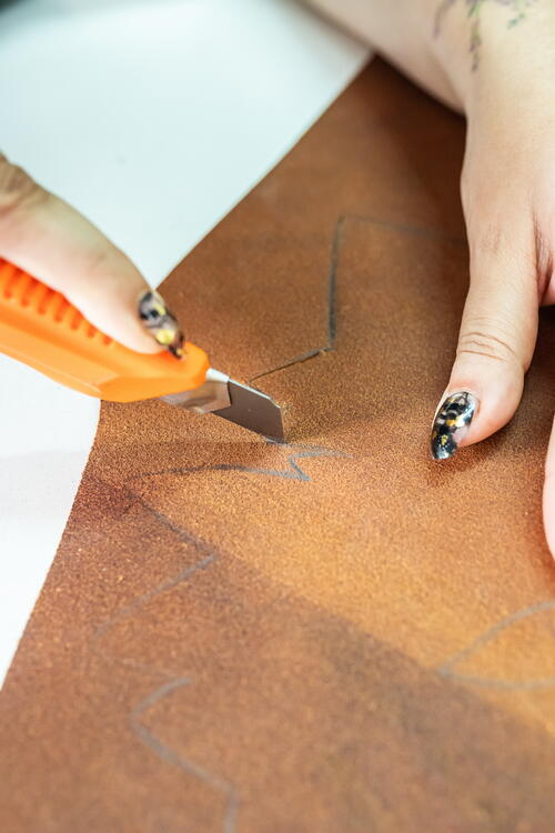 Using a leather cutter or scalpel, cut around the outer margin of the piece and cut out the holes for the eyes.