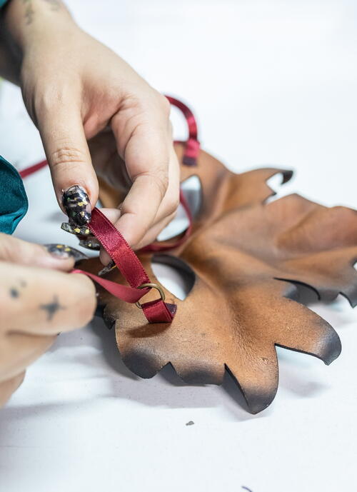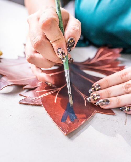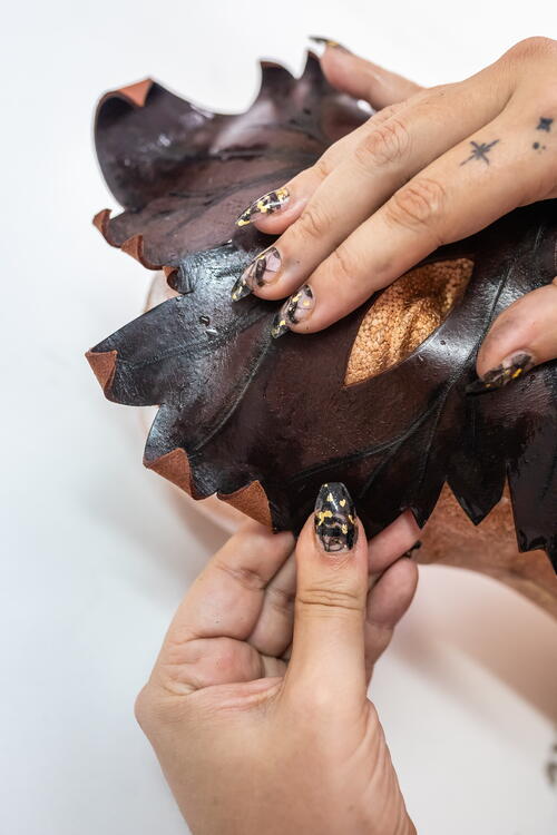 Make very superficial cuts, without going through the thickness of the leather, to depict the veins of the leaf.
