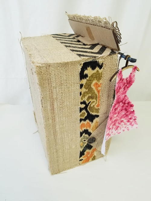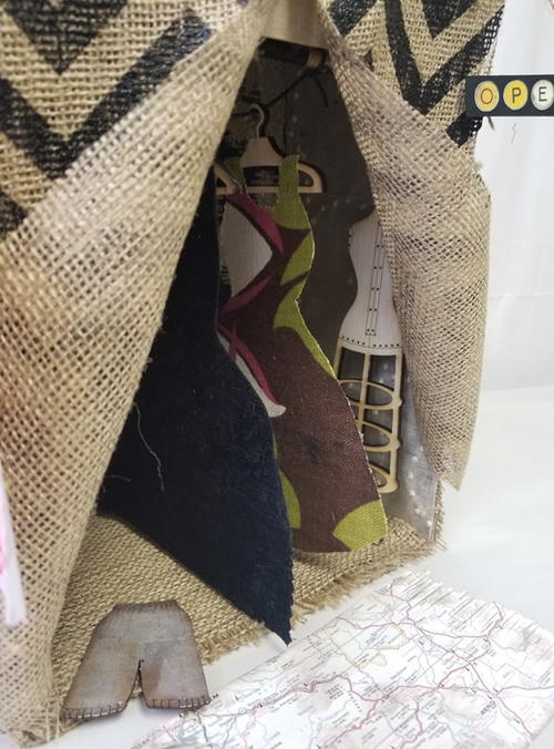 Create curtains by gluing pre cut pieces of printed burlap around an old paintbrush. Adhere to the front of the box. Wrap curtains around side and adhere using a vintage button.