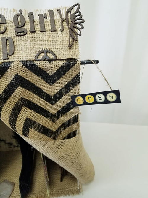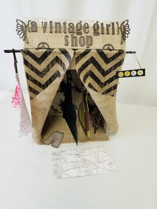 From the Designer: "A Vintage Girl Shop is now OPEN FOR BUSINESS. Come on in and try on one of dresses in stock including a glittery pink gown ready for your next party, a little black dress and something for the summer. A Vintage Girl shop has a dress form, wood hangers, custom open sign, a beautiful store sign with wings and gear and A Vintage Girl alpha set, a paper rug and knickers. All made from Canvas Corp Burlap, Leisure Arts Diamond Art Dress and accessories from A Vintage Girl."