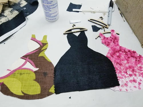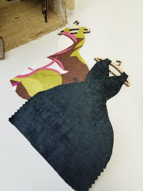 Cut out upholstery fabric to look like a dress, adhere the top shoulder pieces to the wood hangers and hang from the cord inside.