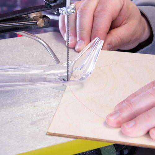 Cut Out the 7 Layers Use the scroll saw to cut out the 7 layers of the window. Be sure to use the thickness specified for each layer. To make the interior cuts for the window, battery compartment and arch windows, start by drilling a small hole inside of each of those areas. Insert the scroll saw blade through the hole and then cut out that area. Use a pencil to write the number of each layer on the front (e.g., in the lower right corner). This will make it easier for you to identify the layers referenced in these instructions.