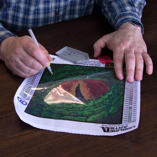 Diamond Art Tip Only pour enough Diamond Gems in to the Craft Tray to cover about two-thirds of the tray and then gently shake (or shimmy) the tray side-to-side so the gems align in the grooves and magically arrange themselves with the faceted side up. This makes the gems quick and easy to pick up and place on the pre-printed design.