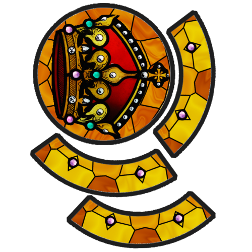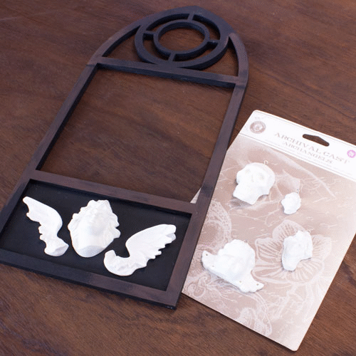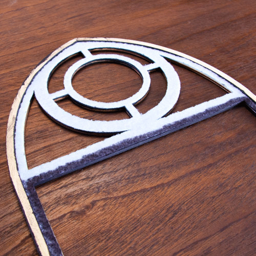 Build Layers 1 and 2 Use DAP RapidFuse to adhere layer #1 on top of layer #2. Clamp and set aside to dry. Once dry, adhere Relics and Artifacts to the front of the piece using DAP RapidFuse. Set aside to dry. Paint the Relics and Artifacts black, let dry, and then stipple burnt umber. This should make the relics and artifacts look like they were “carved” in to the same wood as the window frame. Highlight the ridges of the relics and artifacts pieces with Liquid Gold.