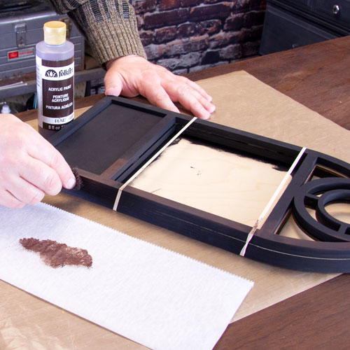 Dry Brush or Stipple Burnt Umber Apply Burnt Umber to the window frame using a dry brush or sponge. Apply as much as you like to get an effect you like. I like seeing some black through the burnt umber, which gives the piece a vintage or distressed look. Set aside to dry.
