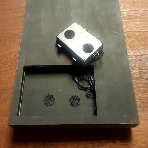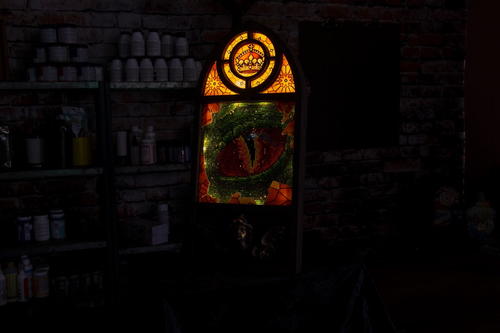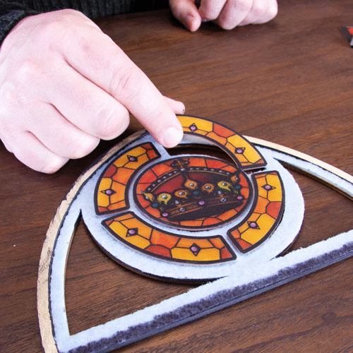 Final Assembly Use DAP RapidFuse to attach layer 1/2 to layer 3/4, being careful that the stained glass pieces remain in place. Clamp and set aside to dry. Attach layer 1/2/3/4 to layer 5/6/7. Clamp and set aside to dry. Touch up with black and burnt umber paint as needed. Use Velcro tape or dots to adhere the battery pack in its niche, against the underside of layer 2.