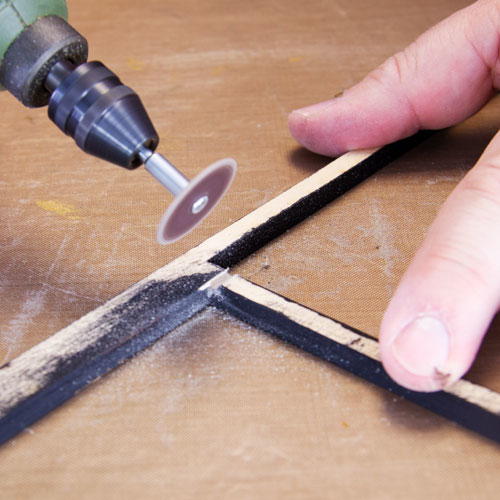 Create a Groove for the Wires Flip layer #6 over, so you are working on the back (or bottom) of that layer. Use the rotary tool to cut a shallow groove connecting the battery compartment to the window area and the window area to the stained glass area. You cutting that groove in the 4 corners of the window, parallel to the sides of the window. This lets you run the wires for the lights from the battery compartment, around the window and then up in to the stained glass area without have to squeeze the wires between layers of wood.