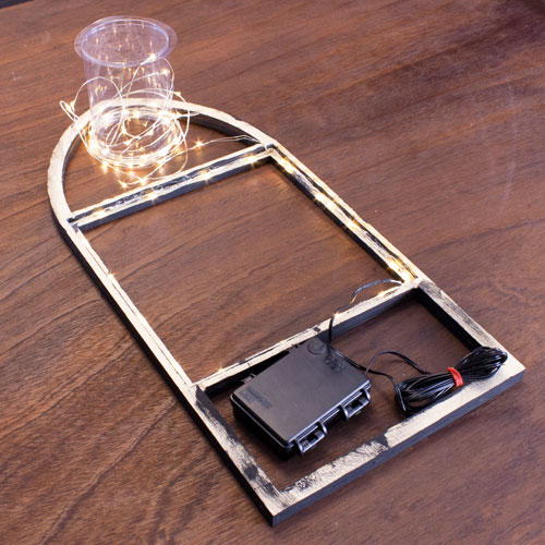 Build Layers 5 and 6 Use DAP RapidFuse to adhere layer #5 on top of layer #6. Clamp and set aside to dry. Flip the piece over and work from the back. Run the wires for the lights from the battery compartment, through the groove, around the window frame (the lights will go around the right side, top, left side, bottom and then right side again), through the groove and then up to the stained glass area. Nestle the lights as close to the outer edge and as flat against the underside of layer #5 as possible. This tucks the lights in under the frame made by layer #5, so the mechanics (i.e., bulbs and wires) aren’t very visible from the front of the finished project. Hold the wires in place with a dot of glue using the hot glue gun. Don’t worry about the lights in the stained glass area. We’ll do that section later, once layer #7 (the back) is in place.
