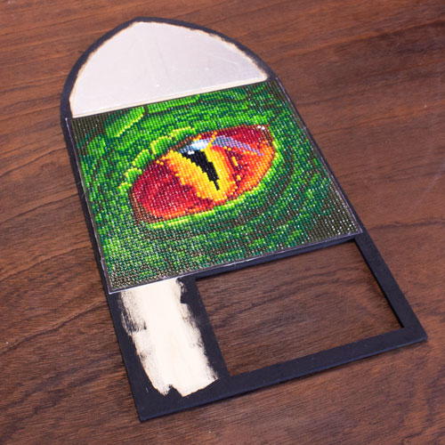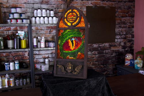 This project is divided up in to 4 parts: 1. Wood Structure 2. Diamond Art Dragon Eye Embellishment 3. Stained Glass Windows (Shrink Film) 4. Finishing and Assembly