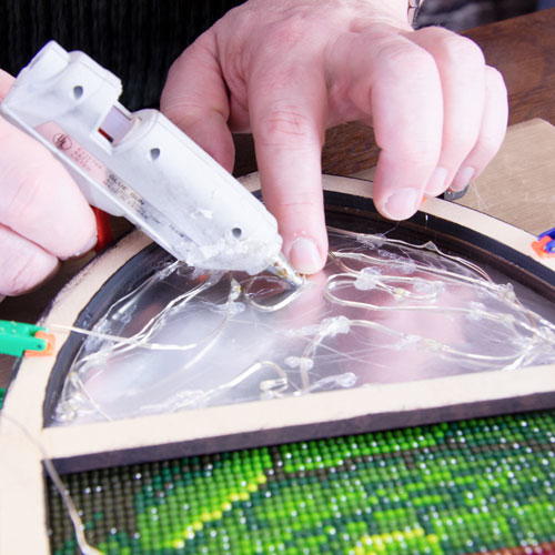 Attach Lights to Layer 7 Use hot glue to attach the lights to the silver reflector in layer 7. It’s best to work with the lights on because it makes it easier to see where some areas need more lights. Don’t worry about the path of the wires or the look of the glue spots. These lights will be behind the stained glass so the mechanics are hidden. Focus on getting the lights as evenly dispersed as possible.