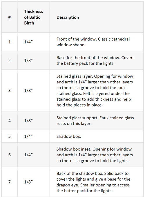 Download the Patterns The structure of the cathedral window consists of seven layers of Baltic Birch. The layers are stacked to give depth to the project and to create “channels” for the stained glass and lights. Download and unzip the Dragon in the Window Patterns (Zip File). Print each pattern for the 7 layers and trace each one on to Baltic Birch.
