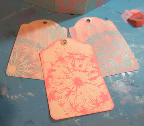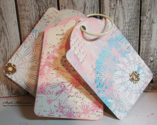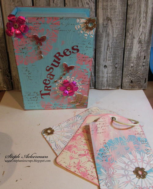 From the Designer: "This little box of treasures can hold so much. Who wouldn't enjoy opening it to see what was inside? Taking about 2-3 hours (plus drying time), use it as a gift within a gift (Mother's Day is coming). Change up the colors and textures and you can create any number of different effects. Use the excess paint on the stencil and your brush and transfer to the tags so you have no waste."
