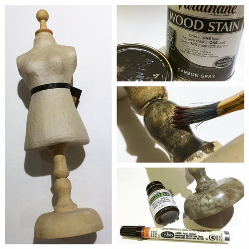 I added some color to the wood accents on the papier mach torso. I used Carbon Gray Varathane Wood Stain - its easy to apply and dries quick. I have never seen or used a gray stain... I love this color and the color it achieved. Some areas didnt take the stain too well and looked a bit spotchy {most likely due to wood glue in the composite shape}, so I added a little more color with a white-wash from a paint pen, then brushing over with a grey acrylic glaze. Set aside to dry. Now the finish is beautiful!