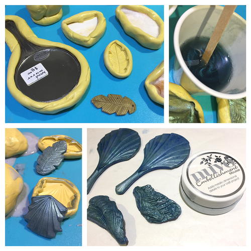 Gather ready to use embellishments to paint or create your own. I created several molds using Amazing Mold Putty: an Art Deco style vintage mirror, a hand-carved polymer clay palm leaf, and some interesting shaped shells; then cast using Ocean Blue Alumidust colorant and Amazing Casting Resin. Ive brushed coloring into the molds and also into prepared resin to give pale blue blanks with a metallic blue surface. The overpour {flashing} tears away easy while resin is still soft and any remaining is trimmed away using Tonic scissors, then smoothed edges with an emory board. I brush the high points with Tonic Nuvo Embellishment Mousse to give shine and brightness to the resin pieces with a nice pearly pale blue.