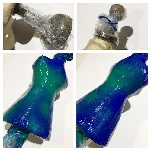 Take some plastic wrap to cover the wooden parts to protect from the fun part... spray painting! I painted on a layer of Mod Podge Matte finish to seal the papier mach torso in preparation to accept the layers of spray paint. Apply bright gloss green and a bright blue, sprayed by alternating colors in no particular pattern. Let dry for a couple minutes between layers.