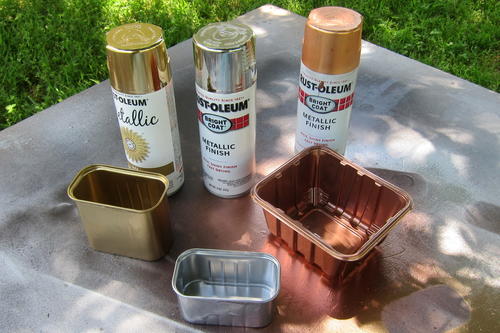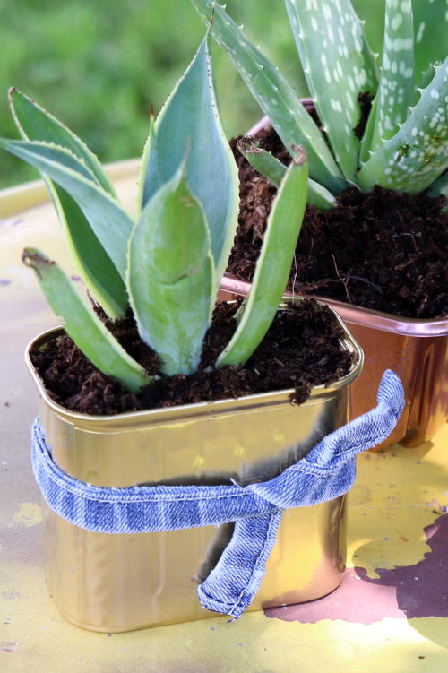 "These recycled food containers never looked better. A little metallic spray paint and denim scraps turned the Spam cans and plastic Mushroom container into a trio of designer looking succulent planters. To make these planters I first thoroughly cleaned them with soap and water. My first thought was just to spray paint the containers but then I remembered the denim scraps I saved after I made my jeans into shorts. How fun would it be to decorate the succulent containers with denim?"