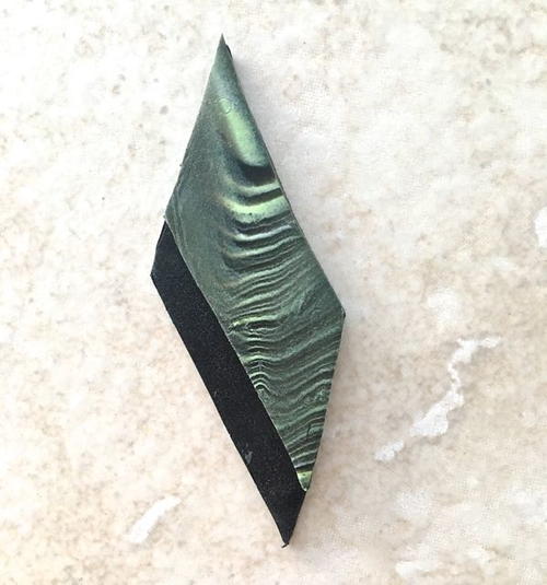 Roll out one and a half ounces of Black Souffle clay on the #2 setting of the conditioning machine. Using the templates, cut out the black necklace pieces with your knife. Arrange them in order on a mat or card stock. Set aside.