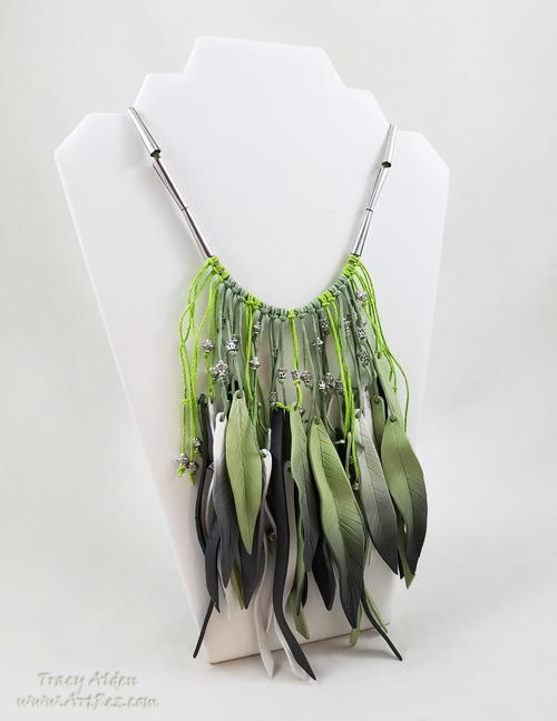 From the Designer: "A one-of-a-kind boho faux leather necklace inspired by Great Green Macaws using Sculpey Soufflé polymer clay. Lightweight, durable and fashionable this is a in trend addition to a Spring-Summer wardrobe. This cascade of cord, clay and metal beads is easily created with common household and crafting supplies in an evening. Supplies: Sculpey® Soufflé™ in Igloo, Pistachio and Poppy Seed, Sculpey® Bead Making Kit, Ceramic tiles, 1 Coffee Straw, Pasta Machine, Paper Towels, Metal Spacer Beads, Cone Tin Beads, Toothbrush, Darice 100% Natural Hemp Cord, 20 lb. Assorted Brights, Cord Faux Suede Olive-Brown 3MM"
