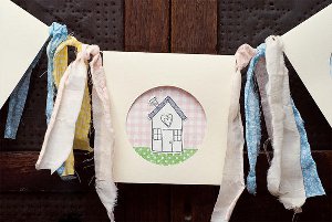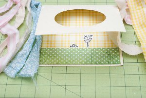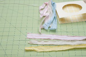 Next, I placed 5.75 x 5.75 inch pieces of patterned paper inside the folded sections of cardstock and ran a long length of twine through each of the sections placing it near the fold. After adjusting the panels to have an equal amount of space between them, I tore 1 inch wide strips of fabric and tied them to the twine between the panels.
