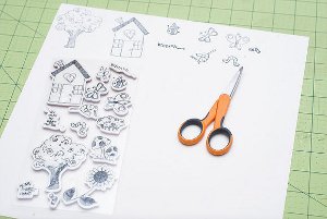 A set of stamps and black ink were used on white cardstock and then cut out using a pair of Fiskars scissors.
