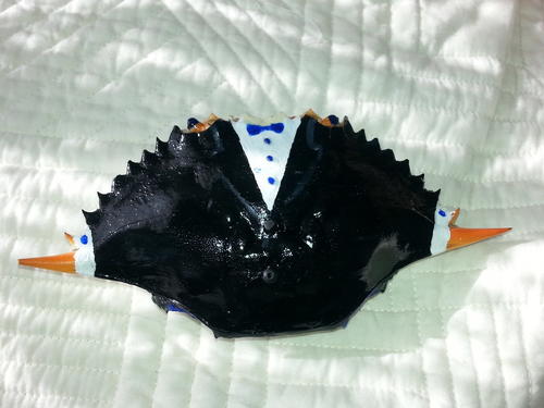 It's painting project, with tweaks. I painted the whole shell white, both sides, except the tips. Allow time to dry between coats. At least 2 coats will be needed to hide the red crab shell. I did the eyes in black. Once dry, I set about depicting the gown or tux.