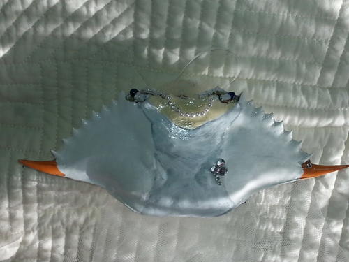 "Painted and adorned crab ornaments, personalized for the bride and groom. The bride wore a white, off the shoulder gown with a rhinestone brooch at the waist, cathedral veil, and a pearl necklace; the groom wore a tux with tie, studs, cuff links and socks in blue to match the bride's shoes. I painted the underside of each crab white, and penned in the wedding date. Each crab has multiple coats of paint. I finished each crab with Mod Podge, to add sparkle."