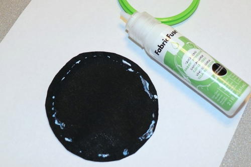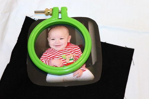 To help keep photo in place while positioning outer clamp hoop over inner hoop, spread a small line of Fabric Fuse around edge of wrong side of photo circle. Place inner hoop on glue and let dry.