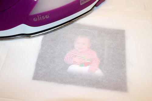Following package instructions for ironing time, cover photo with provided pressing sheet and iron using heavy and constant pressure.