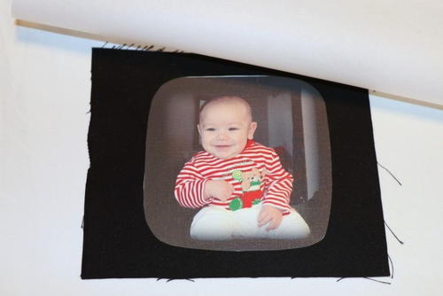 Cut out printed image, leaving a ¼” narrow border and round corners to prevent lifting during ironing. Double check size of photo inside hoop before continuing.