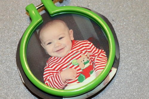 Place clamp hoop over inner hoop, easing photo between hoops. Add bow and hanging ribbon.