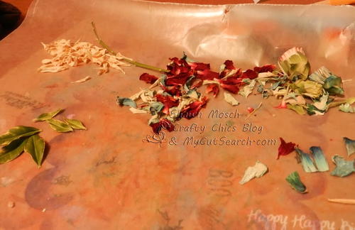 Next it was time to add the dried flowers. First I gently pulled the flowers apart and separated the nice looking petals from the ones that were too small to use or dried all curled up. I put them in three piles . . . red, white and blue. I also had some of the leaves that I saved too.