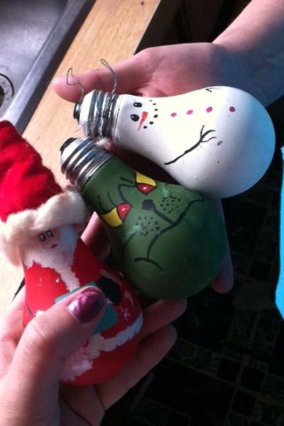 What a unique way to recycle old light bulbs! I do think they are adorable and simple enough to make, but would suggest adding a hat to the top of all three so that you hide the bottom of the bulb.