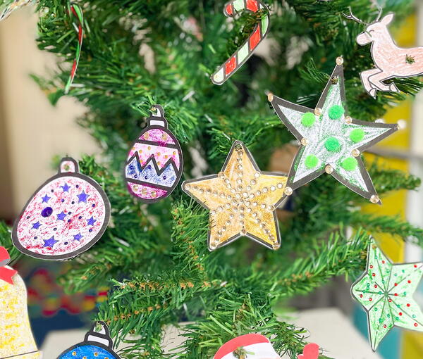 Color in Christmas ornaments using either markers, crayons, or colored pencils.