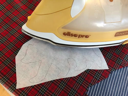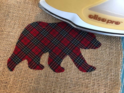 Cut out bear, leaving wide margin around traced shape. Preheat iron to medium heat setting, no steam. Following package instructions, place bear adhesive side down and fuse to wrong side of plaid fabric. Let cool.