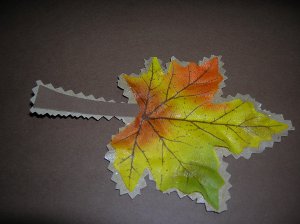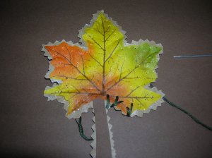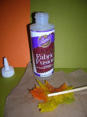 Apply fabric glue to the back of the leaf with a bamboo skewer. I find a skewer easier to use to apply glue than a paintbrush which gets all gummy.