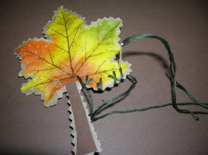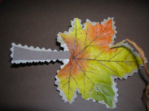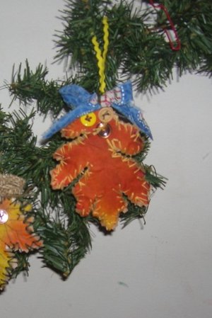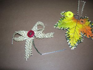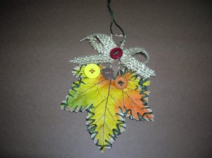 Punch a hole in the stem of the leaf and tie on a strand of thread for a hanger. After the bow is attached sew the buttons on with contrasting thread.