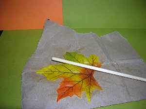Use the skewer (or your fingers if you don’t mind “glue fingers”) to press the leaf onto the paper bag.