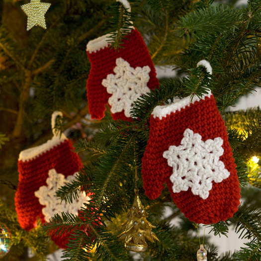 Crochet an adorable little red mitten with a white snowflake for a holiday ornament this season. The crochet ornament can also be used as a table accent, as shown in the image holding utensils. Make this holiday ornament crochet pattern today.