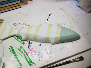 - Using the same method as you did with the head, apply thin coats of paint with a cosmetic sponge and use a paintbrush for the second coat. Vary the colors of the stripes between light mocha, light sea green and light blue. Remove tape and allow to dry.