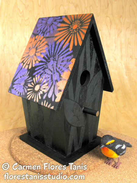- Spray the sides of the birdhouse with Krylon ColorMaster black satin paint. This will give you a cool two-tone effect! Let dry 10 minutes then remove the paper tape and vinyl leaves. Remove the paper and tape from the roof.