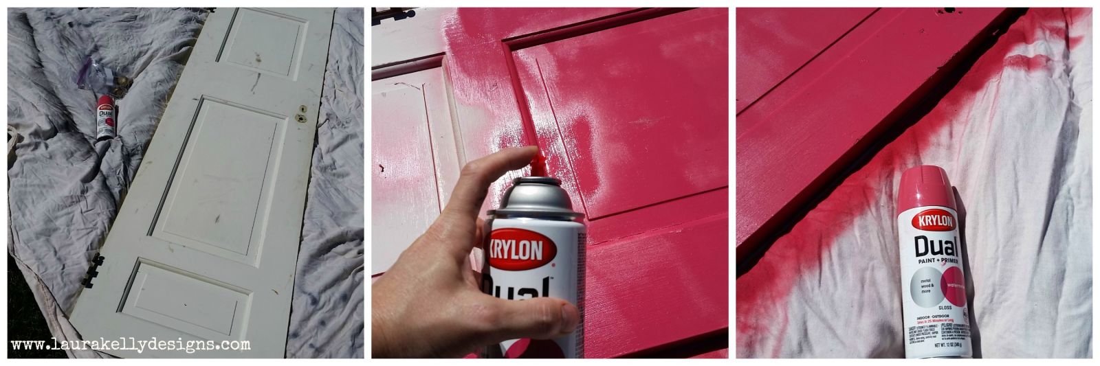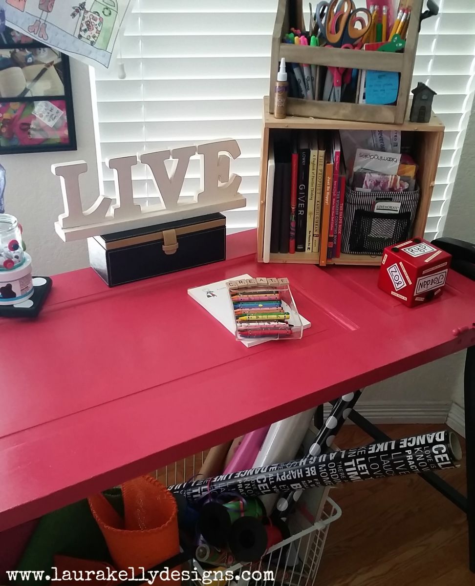 Learn How to Turn a Door into a Desk with this easy project. Laura used a door from her first home with her husband which makes this project extra special. Transform an old door with Krylon spray paint and give it a new purpose as a craft table in your home.