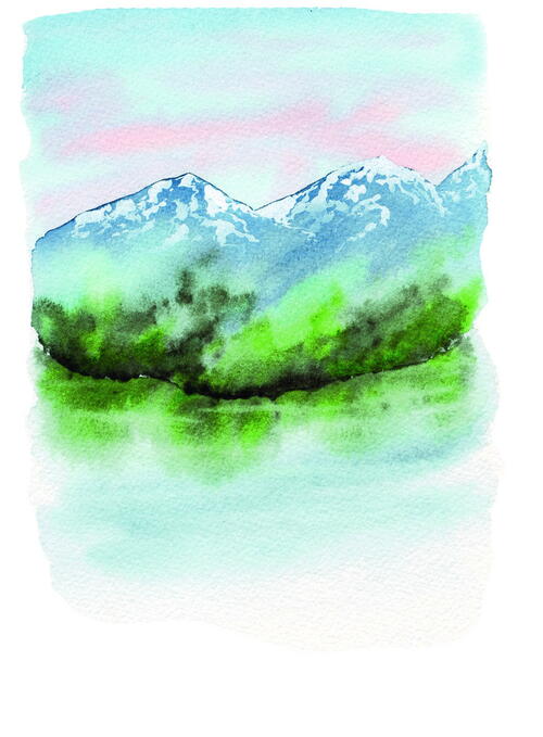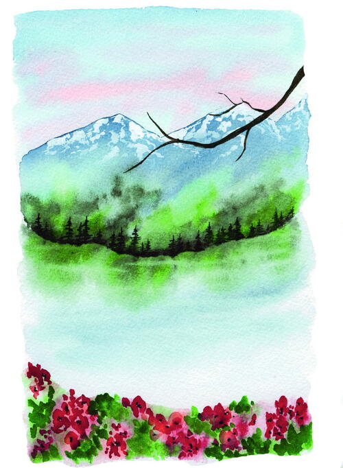 Let dry, then repeat the process with slightly darker blue. While the water is still wet, add a blurry reflection of the trees along the bottom of the mountain. Then, use a damp brush to lift a few lines of pigment and reveal the white space underneath throughout the lake, leaving behind subtle white ripples in the water.