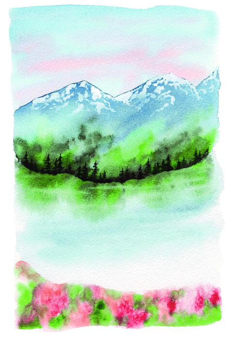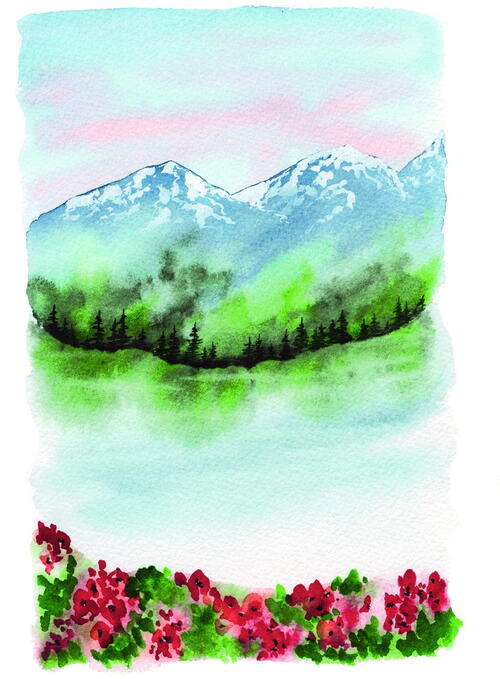 Peace is the word that comes to mind most often when I think about venturing into the wilderness, which is why I go back again and again. For our final project, let’s capture that essence using every element we’ve practiced: a textured sky, mountains, trees, wildflowers, and water. This design isn’t the most complicated, nor is it the most difficult in the book—but for me, it represents why we need the wilderness in the first place.