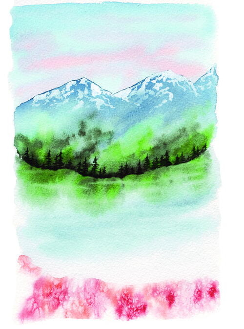 Create the first layer of the mountain using a mid-range Indigo, stopping about the middle of the paper. Then, while the mountain is still wet (wet-on-wet technique, page 19), add some blooms of Hooker’s Green and Perylene Green along the bottom of the mountainside for texture and to act as a base layer for the tree line. These blooms can be highly pigmented in places—we want that contrasting texture to add complexity to the mountain forest. Let dry.