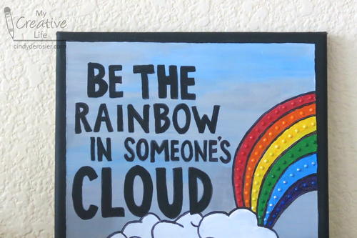 Using the Sharpie lines as a guide, paint the words in the quote black. Paint dividing lines between the colors of the rainbow black. Finally, paint the edges of the canvas black.